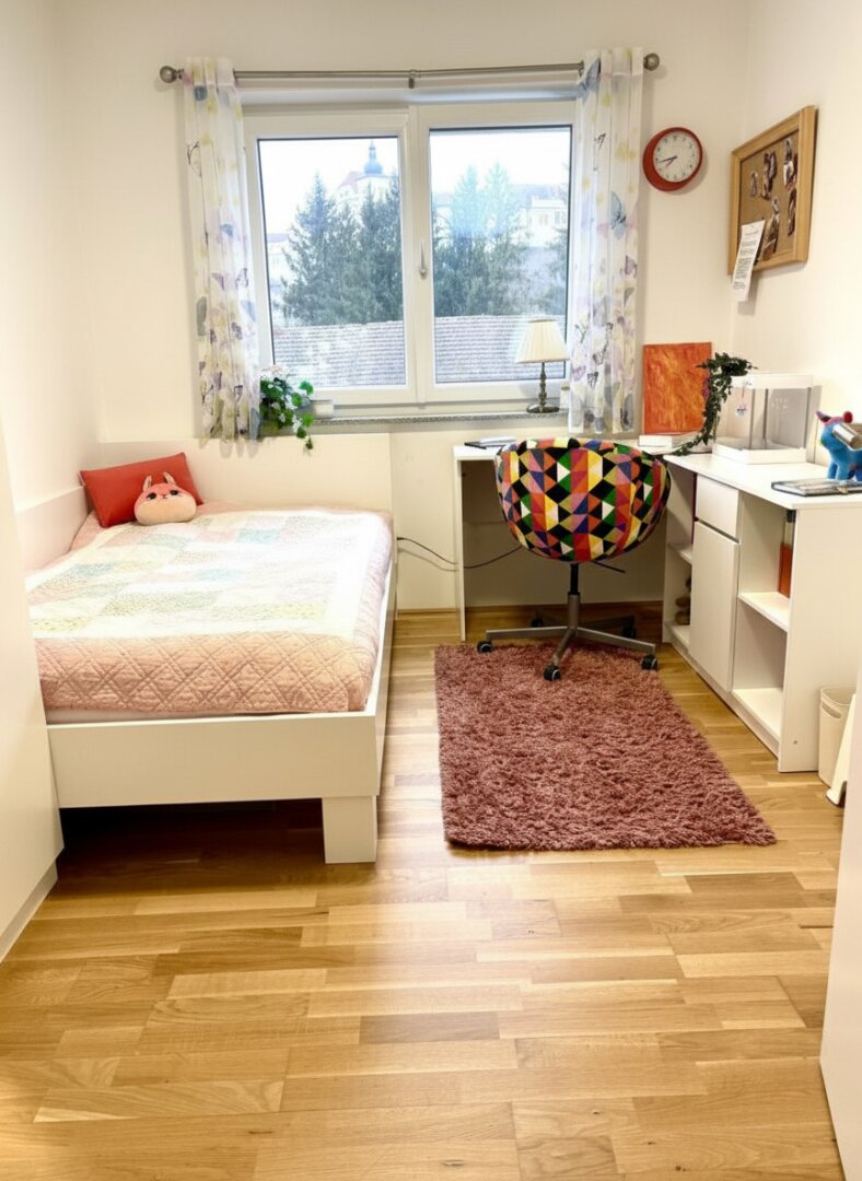 Der durchdachte Grundriss bietet zwei gut geschnittene Kinderzimmer, ein gemütliches Schlafzimmer sowie ein Badezimmer mit Dusche, Badewanne und WC. Zusätzlich steht ein separates Gäste-WC zur Verfügung – ideal für Familien und Besucher. Herzstück der Wohnung ist der großzügige, offen gestaltete Wohn- und Essbereich: Hier eröffnet sich ein beeindruckender Blick auf den Ennser Stadtturm und das Schloss Ennsegg – ein Ausblick, der jeden Tag besonders macht. Vom Wohn- und Essbereich gelangt man direkt auf den großzügigen, überdachten Balkon, der zum Entspannen im Freien einlädt.