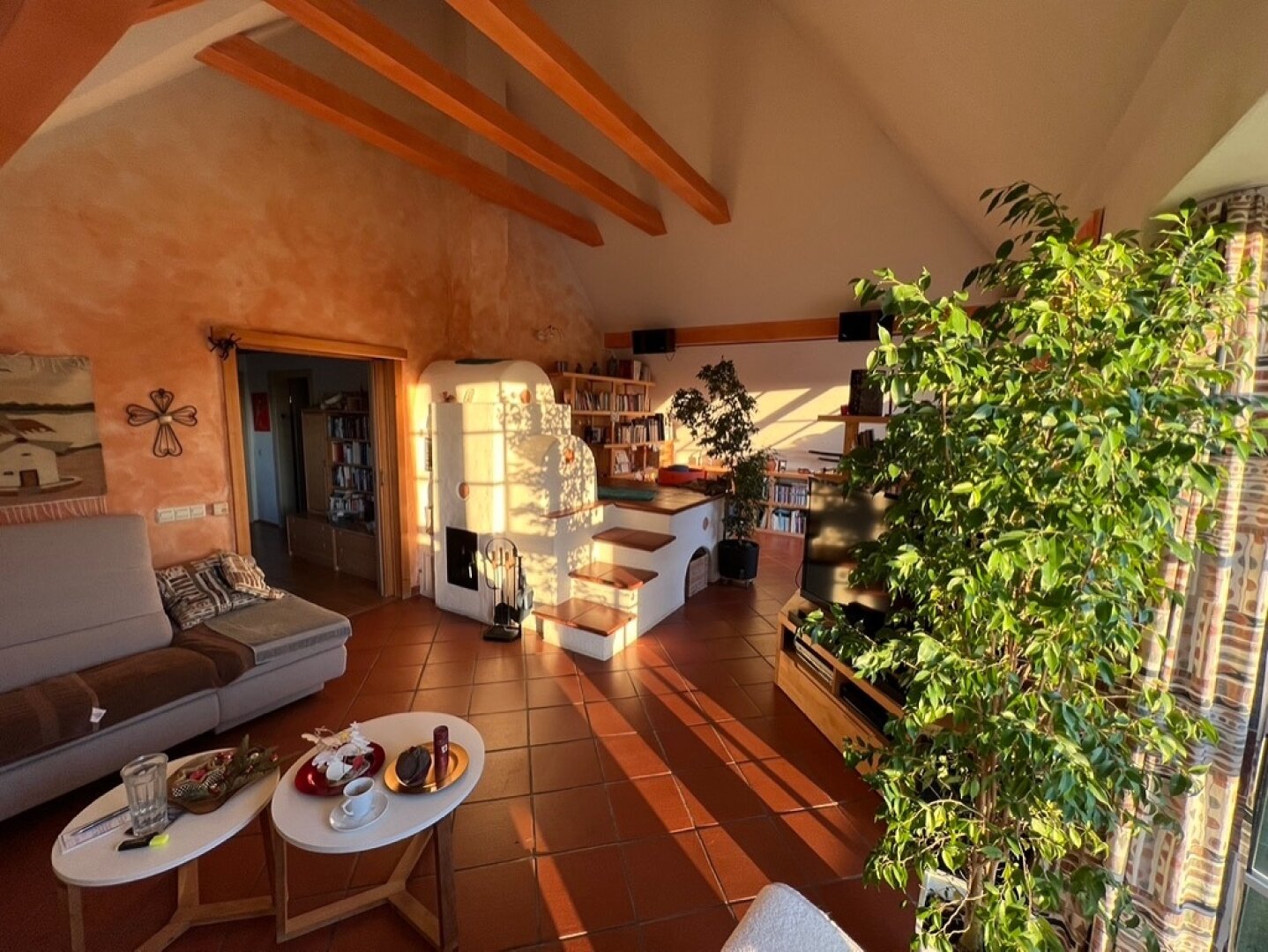 Die Wohnung im 1. Obergeschoss punktet mit einem gemütlichen Kachelofen – ideal für stimmungsvolle Abende und als energieeffiziente Zusatzheizung in der Übergangszeit.